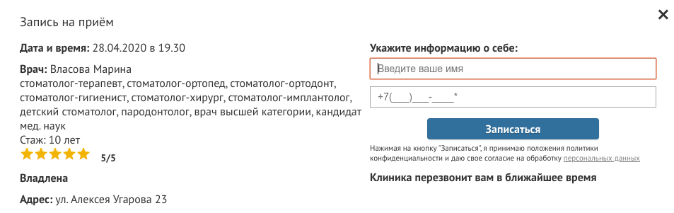 Если у вас нет МИС или вы еще не наладили интеграцию, то на сайте должна быть форма записи на приём как минимум из двух полей — имя и телефон. Уместно также добавить календарь с возможностью выбора желаемой даты и времени, а также текстовое поле с предложением кратко описать, что интересует клиента. Пользователю это, по сути, ничего не даёт, но администратору будет легче сориентироваться в расписании врачей и предложить клиенту подходящий вариант для записи, что может уменьшить общее время звонка.