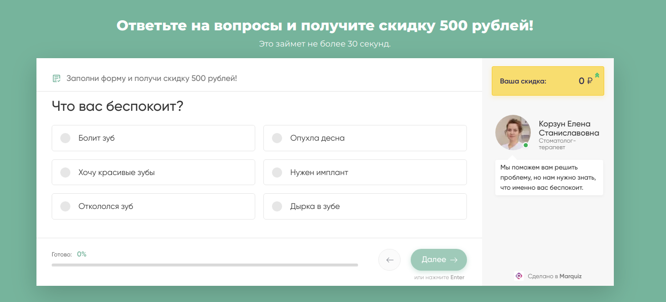 Для всех сфер, где итоговая стоимость услуги или товара складывается из многих вариативных составляющих, актуальны интерактивные калькуляторы. Калькулятор может быть по одной ключевой услуге, например имплантации, или по ряду услуг. Можно соединить калькулятор с квизом — сначала узнать о проблеме пользователя, потом предложить ему варианты решений с расчётом стоимости. В лид-форме в данном случае нужны только имя и телефон.