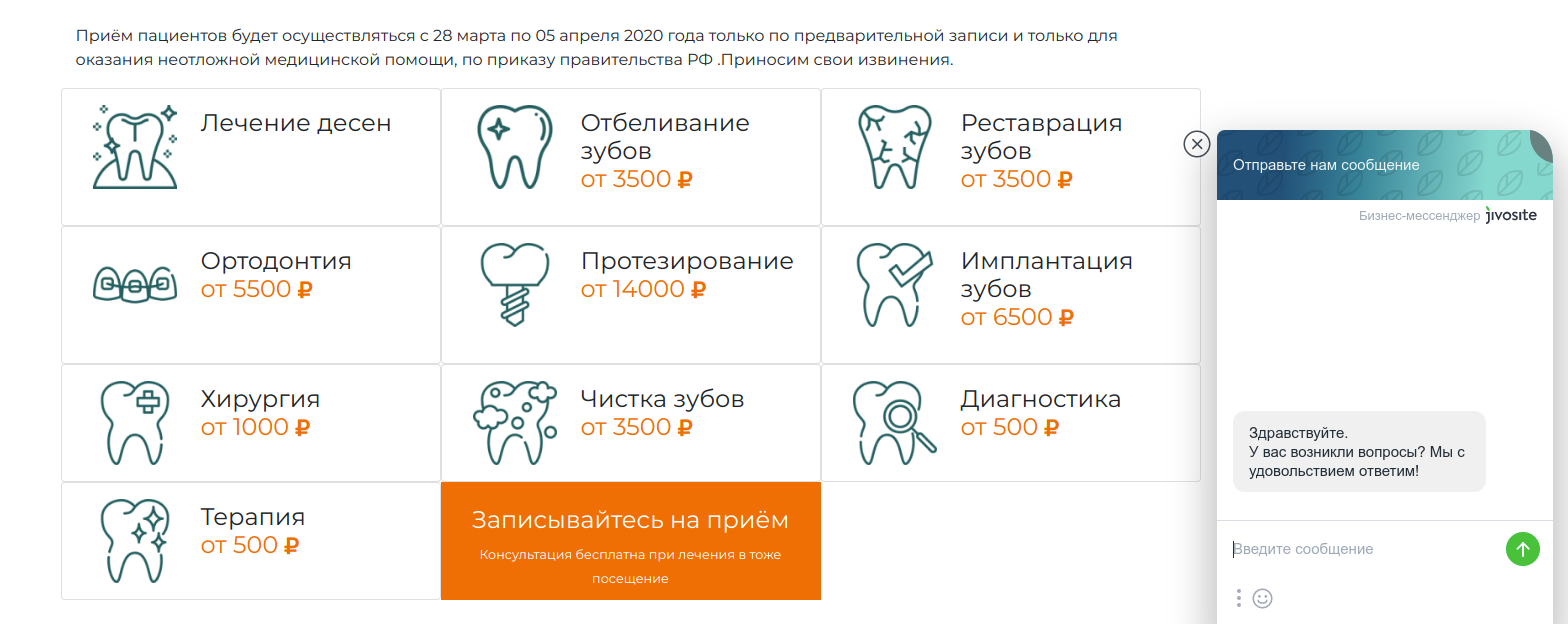 Мессенджеры сейчас — один из самых популярных способов общения с потенциальным клиентом. Это удобно как для пользователя, так и для администраторов. Многие люди не любят общаться голосом или ищут врача, сидя на работе или с маленьким ребенком. Администратору будет удобнее развернуто ответить на вопросы клиента и сориентировать его по прайсу. Если вы пользуетесь мессенджерами — обязательно разместите информацию о них на сайте, если нет — самое время начать использовать их для повышения продаж. Иконки Telegram, WhatsApp, Viber с призывом задать вам вопрос можно разместить в разделе Контакты, в футере, хэдере, в прайсе, на страницах услуг, акций и в любом другом месте, где у пользователя могут возникнуть вопросы или желание общаться с вами.