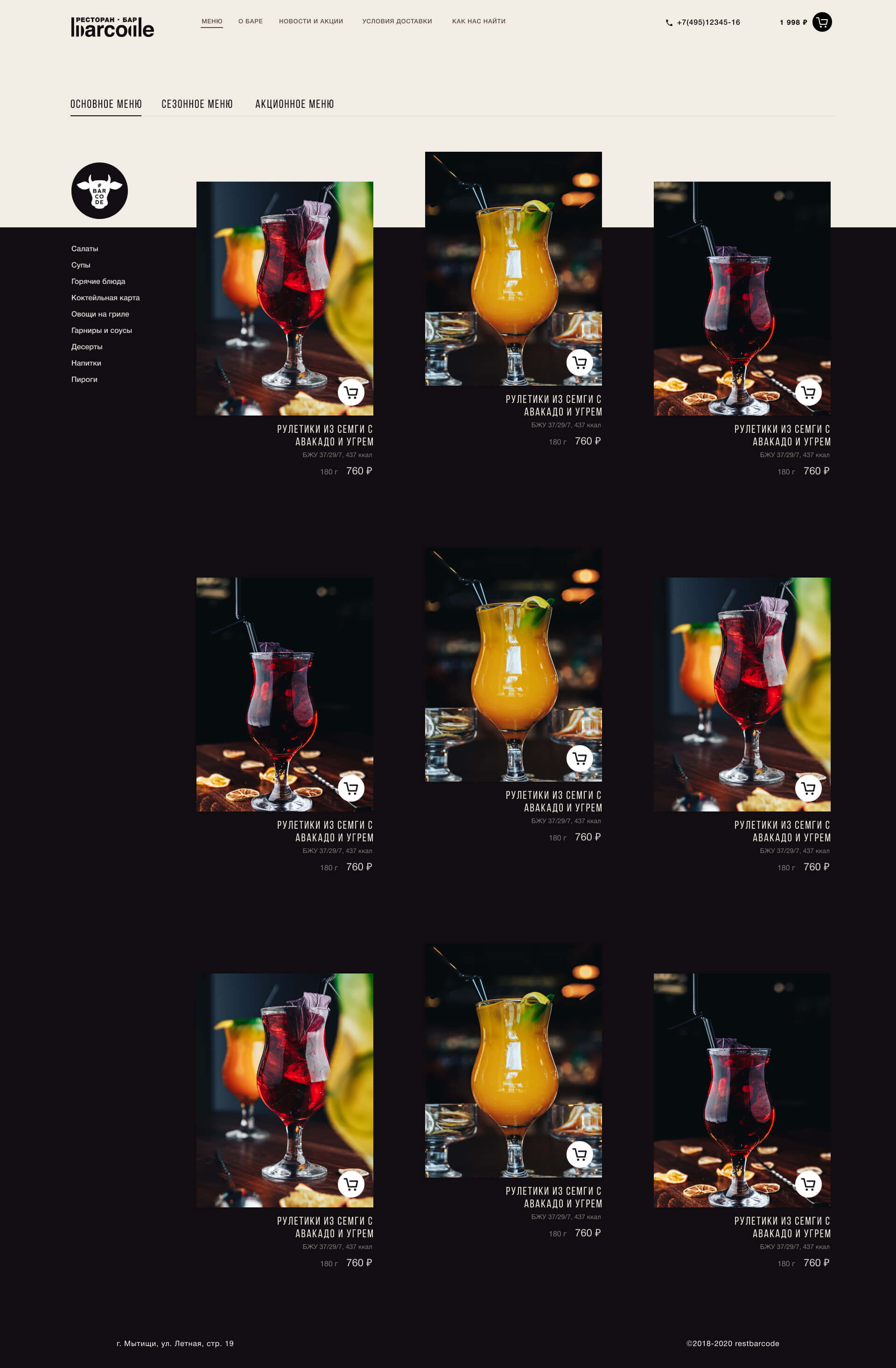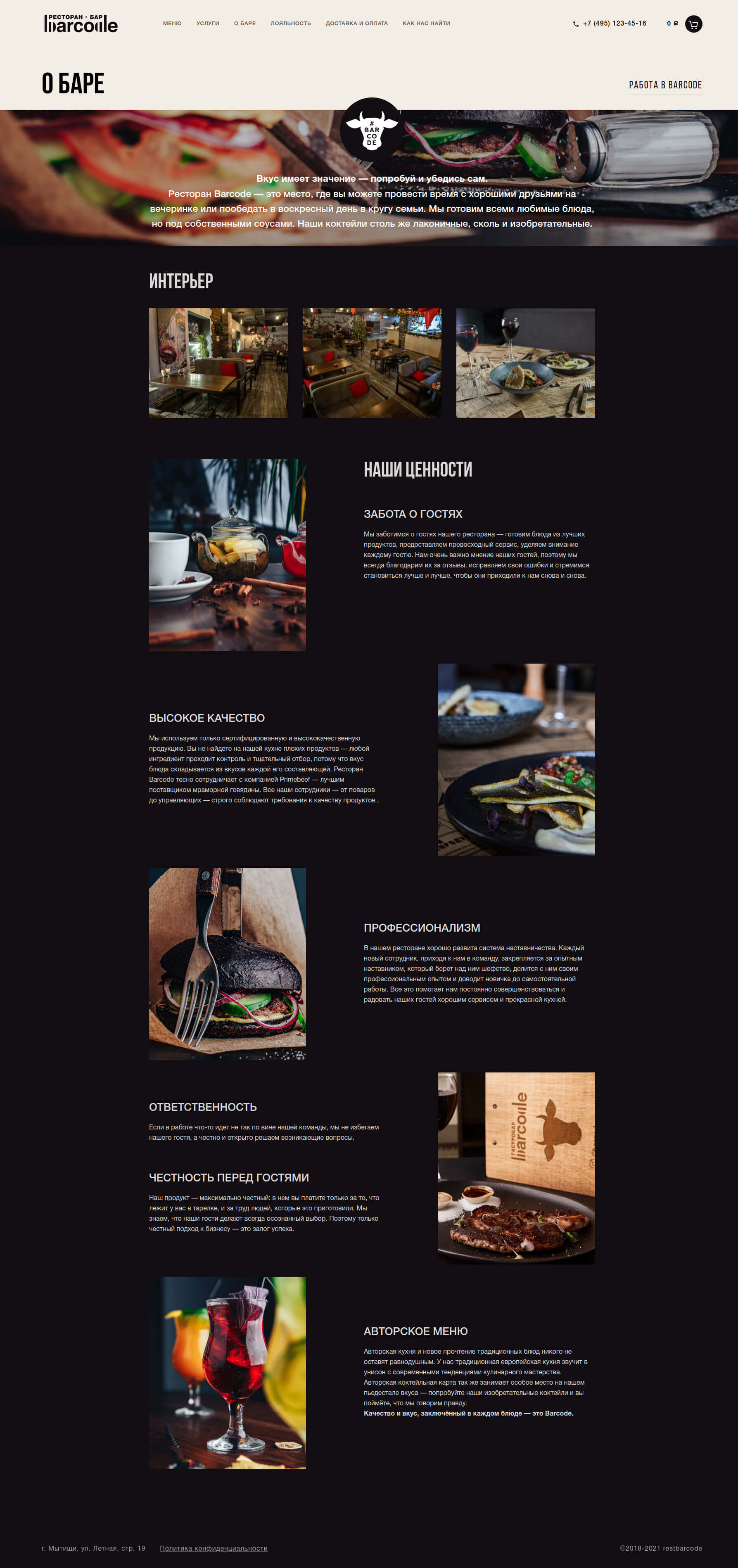 Barcode — ресторан с уникальной атмосферой и интересным меню. Разрабатывая дизайн сайта, мы ориентировались на фирменный стиль заведения, выполненный в тёмных тонах. Качественные сочные фотографии помогли нам найти вдохновение и получить прекрасный результат.