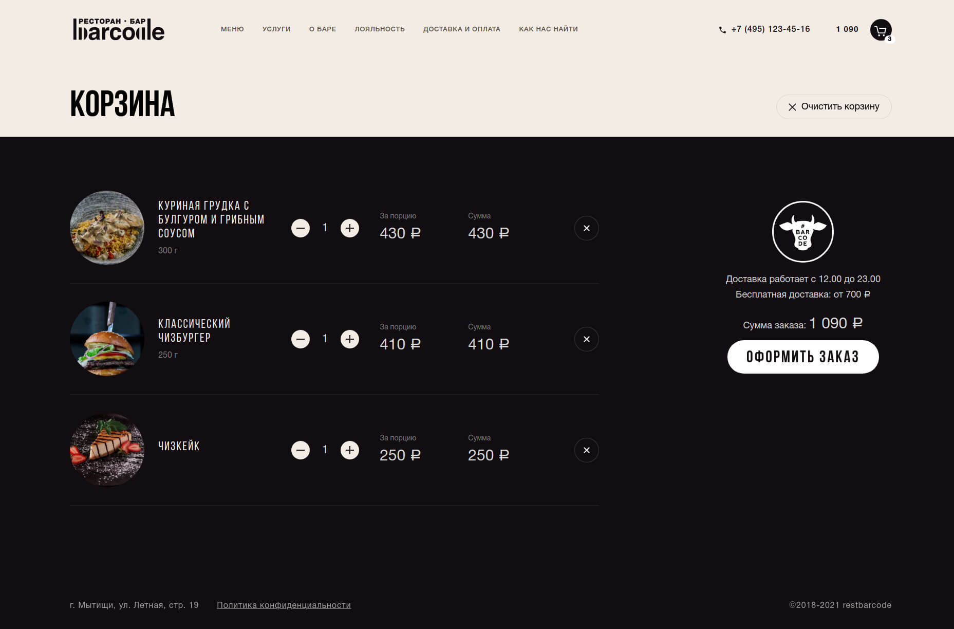 На сайте реализован функционал оформления заказов, так как ресторан работает и на доставку
